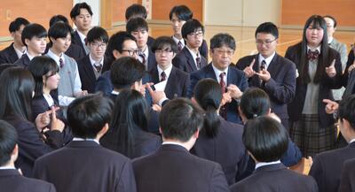 卒業生の金言を手帳に書き留める2年次生