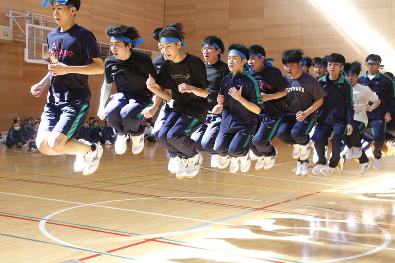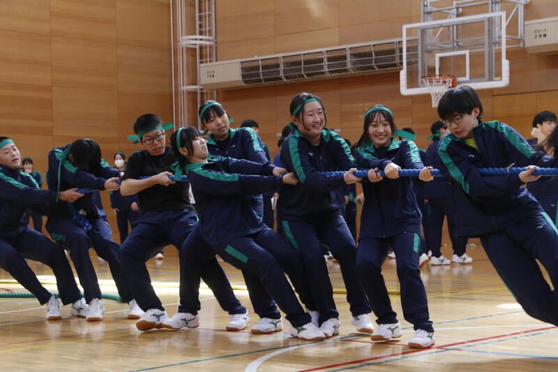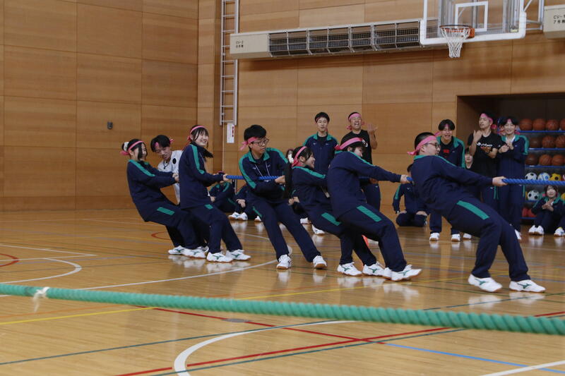 昼食後は、研修3「体育大会」を実施しました。種目は『クラス対抗長縄跳び』『5色綱引き』『3人4脚リレー』です。どの種目も大変盛り上がり、仲間同士で声を掛け合いながら取り組む姿が多く見られました。失敗しても励まし合い、成功すれば喜びを分かち合う中で、クラスの団結力が一気に高まっていきました。また、1Aピンク・1Bブルー・1Cイエロー・1Dグリーンのクラスカラーのもと、それぞれがハチマキを身につけて種目に臨みました。色事の一体感も生まれました。優勝は1Aでした。